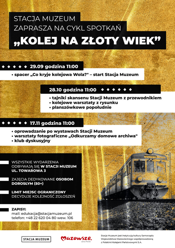 Plakat informacyjny Stacji Muzeum zapraszający na cykl spotkań Kolej na złoty wiek. Daty wydarzeń: 29 września, 28 października, 17 listopada. Zajęcia dedykowane osobom dorosłym 50+. Liczba miejsc ograniczona, decyduje kolejność zgłoszeń. W tle złota faktura oraz grafika pociągu. Na dole logotypy Stacji Muzeum i Mazowsze – serce Polski